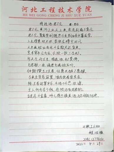 通过此次活动,同学们借此机会认真抄写,仔细体会与古人来一场跨时空的交流,体会诗人当时的处境。提升了自己的文化修养,优秀的文化知识潜移默化到每一位同学的心中。