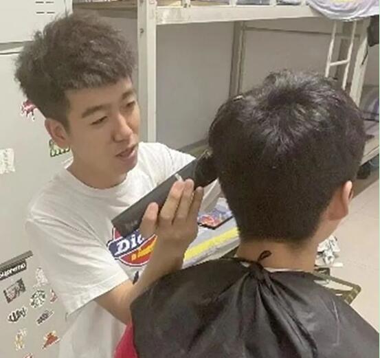 天气逐渐变热,再加上封校管理,侯仕伟同学在课余时间自学了理发新技能,化身“托尼老师”,为同学们解决“头等大事”。他自觉主动在宿范围内的空闲时间,在宿舍内提供免费理发服务,跟同学互助理发,开启了在宿舍理发新潮流。
