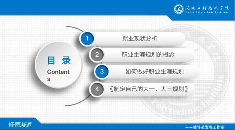 班会从就业现状分析、职业生涯规划的概念和如何做好职业生涯规划三方面进行。首先,辅导员老师分析了当前的就业形势和专业特点,从事件、角色、环境三方面点出老员工活的内容与意义,由此引出生涯规划的重要性。