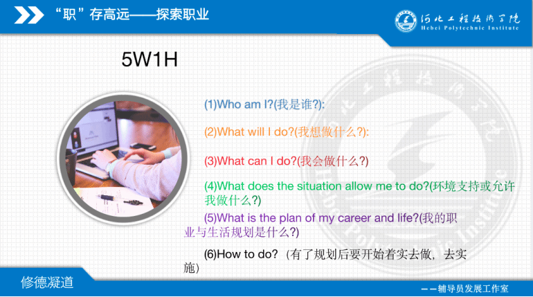 最后讲解了如何用5W1H和SWOT分析法制定大学规划,让员工明白制定规划的最终环节是去做,只有把计划付诸于实践,才能离目标越来越近。