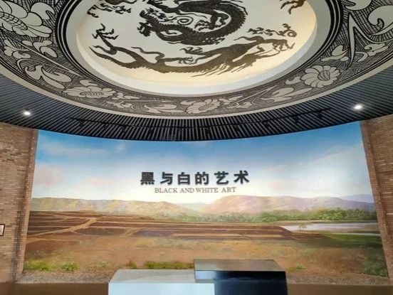 序厅外形为磁州窑典型的馒头窑形状,居于博物馆的中央位置。序厅圆形内墙以烧成色壁砖和匣钵为装饰,突出表现“窑”的氛围。正中墙体上有大幅“观台窑址”喷绘照片,照片上有馒头窑、漳河、黄土地和陈列标题“黑与白的艺术”。照片前面为黑白两块相互连接的落地长方体块石,分别镌刻着中英文前言。顶部装饰系两个层次构造的白地黑花大龙盆“龙纹”图案和龙凤罐“葵花纹”图案。