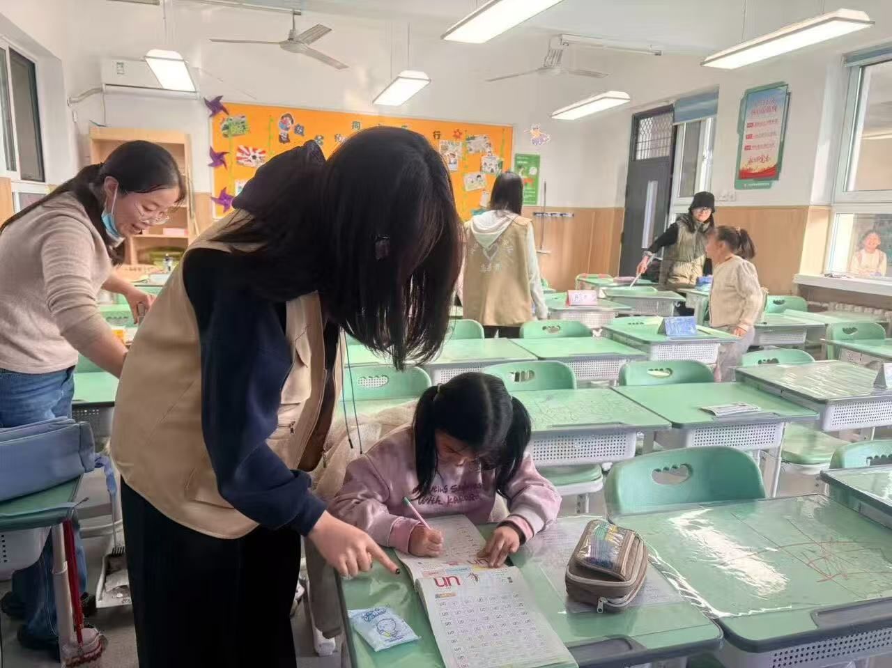 活动开始后,志愿者在教室协助老师维持秩序,引导小朋友们坐好。期间一部分志愿者和小朋友一同打扫卫生,使他们知道了劳动的重要性。另一部分志愿者对小朋友的作业进行辅导并协助其完成,引导他们养成独立思考的习惯;有的志愿者还组织了安全知识的折纸小游戏,将安全知识融入到游戏中,使其简单易懂,小朋友们积极参与,跟着志愿者学习折纸并在相互帮助后完成作品,在玩的过程中学到了知识也明白了团结的重要性。活动最后,志愿者帮小朋友们整理课本和课桌上的文具,陪他们等待家长,并对小朋友们的还存在的问题进行解答,小朋友们与志愿者分享着今天学到的知识和存有的疑惑,整个教室充满了欢声笑语。