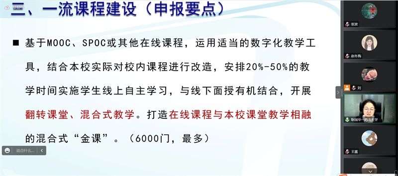 然后,耿教授又给大家讲明如何进行一流课程建设,以自身建设《数据结构》课程的经验告诉大家:可以基于MO0C、SP0C或其他在线课程,运用适当的数字化教学工具,结合本校实际对校内课程进行改造,开展翻转课堂、混合式教学,打造在线课程与本校课堂教学相融的“金课”,并且要恰当、适时地融入课程思政的内容,做好立体化教学资源建设。