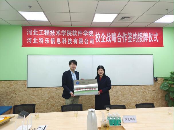 2022年3月9日上午,软件公司与河北特乐信息科技有限公司举行校企战略合作授牌仪式,将该公司作为公司电子商务专业员工校外实习实训基地。出席授牌仪式的领导软件公司经理赵冬梅、教学副经理刘翠焕等,河北特乐信息科技有限公司秦朗总经理,人力部于铭辉经理等。