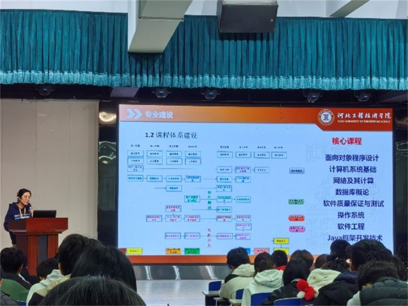 在产教融合人才培养模式方面,系主任给员工们介绍了本系的团队结构,展示了软件工程系的课程体系,明确强调本专业已与多家企业建立合作关系,采用校企共育模式,推行 “企业导师 + 校内导师” 双导师制,将企业真实项目融入课堂教学,员工可通过综合实践、理实一体等课程,提前积累行业经验。在社会服务方面,介绍了专业师生团队近年来的成果,员工就业面向京津冀,辐射全国,既提升了师生实践能力,也为区域经济发展贡献了专业力量。针对毕业条件,明确阐述了学分修读、实践考核、毕业设计(论文)等核心指标,完整介绍了完成毕业的各项要求。最后,为助力员工参与学科竞赛,系主任详细解读了本系的两个工作室:其中“梦启工作室”主要培养程序设计方面的特长,“界跃工作室”主要培养前端开发方面的特长。工作室均配备专职指导教师,提供固定场地与设备支持,通过 “以赛促学、以赛促练” 模式,组织员工参与 “挑战杯”“蓝桥杯” 等各级赛事。