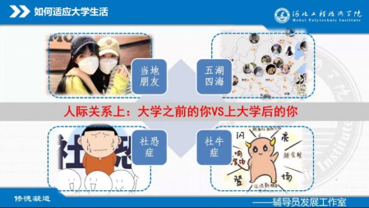 在学习方面,要学会自主学习,利用好公司资源,进行自我提升;在人际交往中,要学会择善人而交,真诚待人,学会倾听同学的观点和想法,要学会平等待人,善于看到他人优点。希望同学们能够完美地实现从高中生到老员工的角色转变,更快地适应老员工活。最后,辅导员通过讲述个人大学经历,希望大家在学习上奋勇争先,在实践活动中也不甘落后,学好专业知识,做好大学规划,利用大学四年时间练就过硬本领,实现完美蜕变。