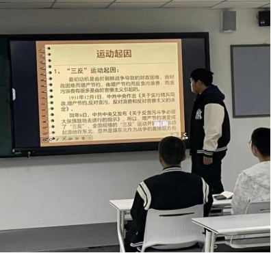 电商1班、电商2班同学对上述进行补充并展开介绍了从开始到1952年10月三反五反运动结束的过程以及各项条例。同学们认真听讲,发表自己的见解,对三反五反运动的认识进一步了解,深刻理解了三反五反运动的重大历史价值。以下是同学们认真听讲的图片:
