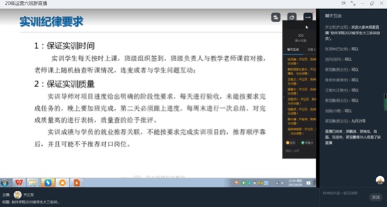 实训期间各实训导师通过线上开展教学,项目操练期间通过视频会议模式开展教师指导,实训导师可以直观了解员工在家期间实训表现和进度。各班级职业引导师在实训期间规范组织员工课前签到,课中听课,检查员工课堂表现,充分做好与教学老师的每日实训对接,使员工管理和教学开展做到无缝对接,最大程度做好实训效果的把控。